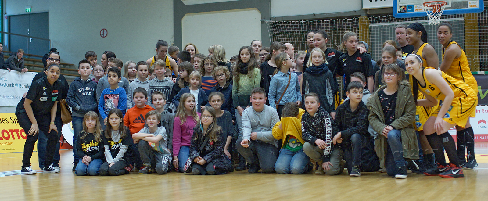 Schulkinder, die mit den Royals-Damen trainiert haben, dürfen mit ihren großen Vorbildern auf das Spielfeld laufen. Vor Beginn jedes Bundesligaspiels werden die Basketballdamen aus Saarlouis großartig in der abgedunkelten Stadtgartenhalle empfangen.